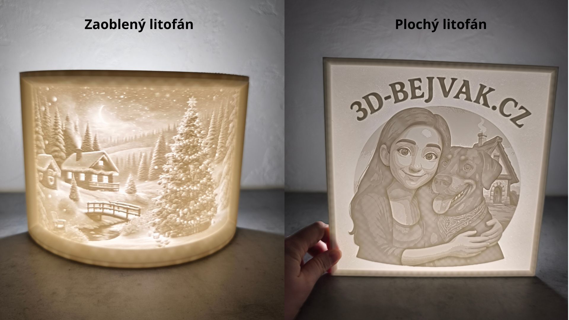 Chcete originální dekoraci, dárek, nebo jedinečný způsob, jak uchovat vzpomínku? Litofán vyrobený z vaší vlastní fotografie je krásný a osobní způsob, jak nechat světlo vyprávět váš příběh. Litofány vyrábíme na zakázku pomocí 3D tisku, a proto jsou vždy naprosto jedinečný.